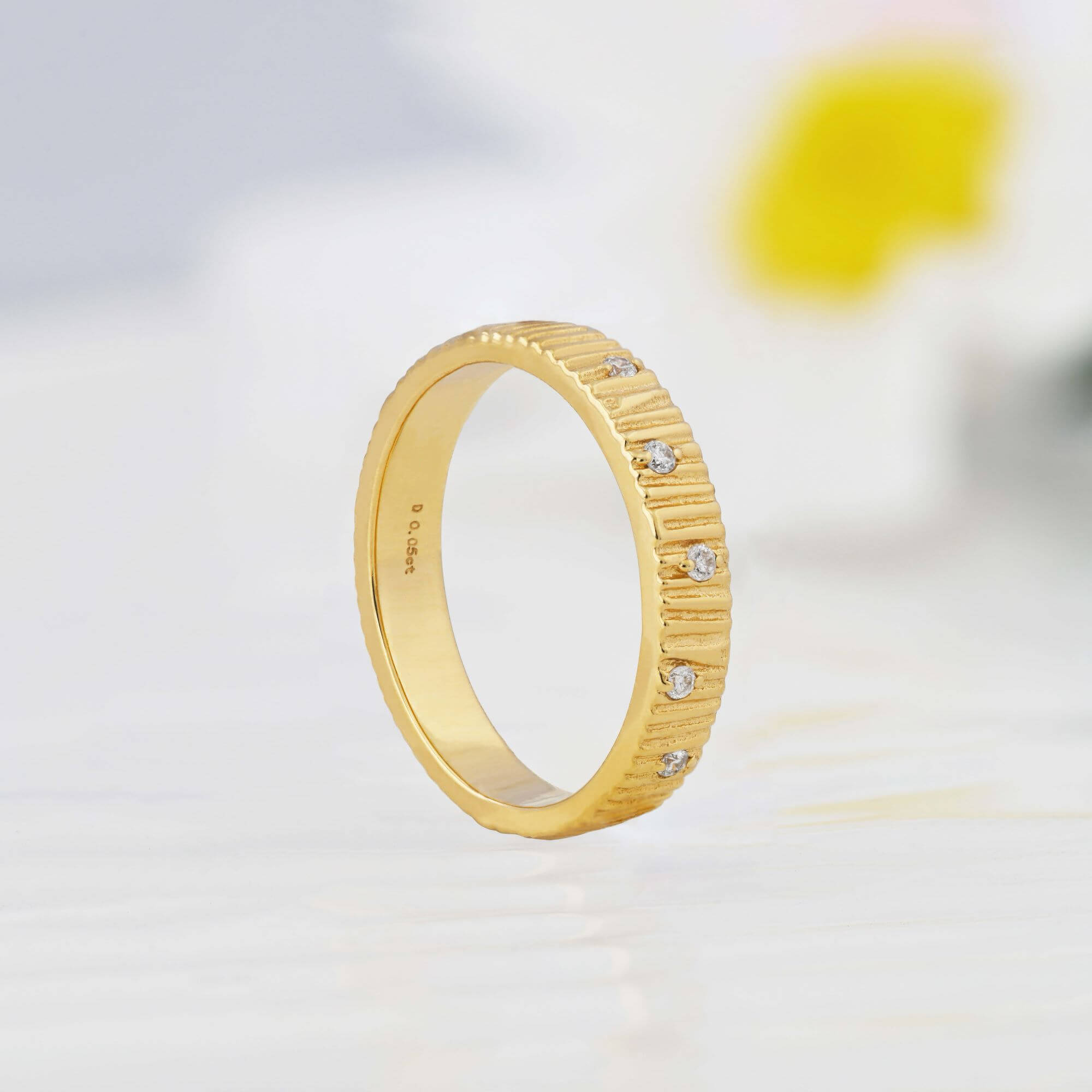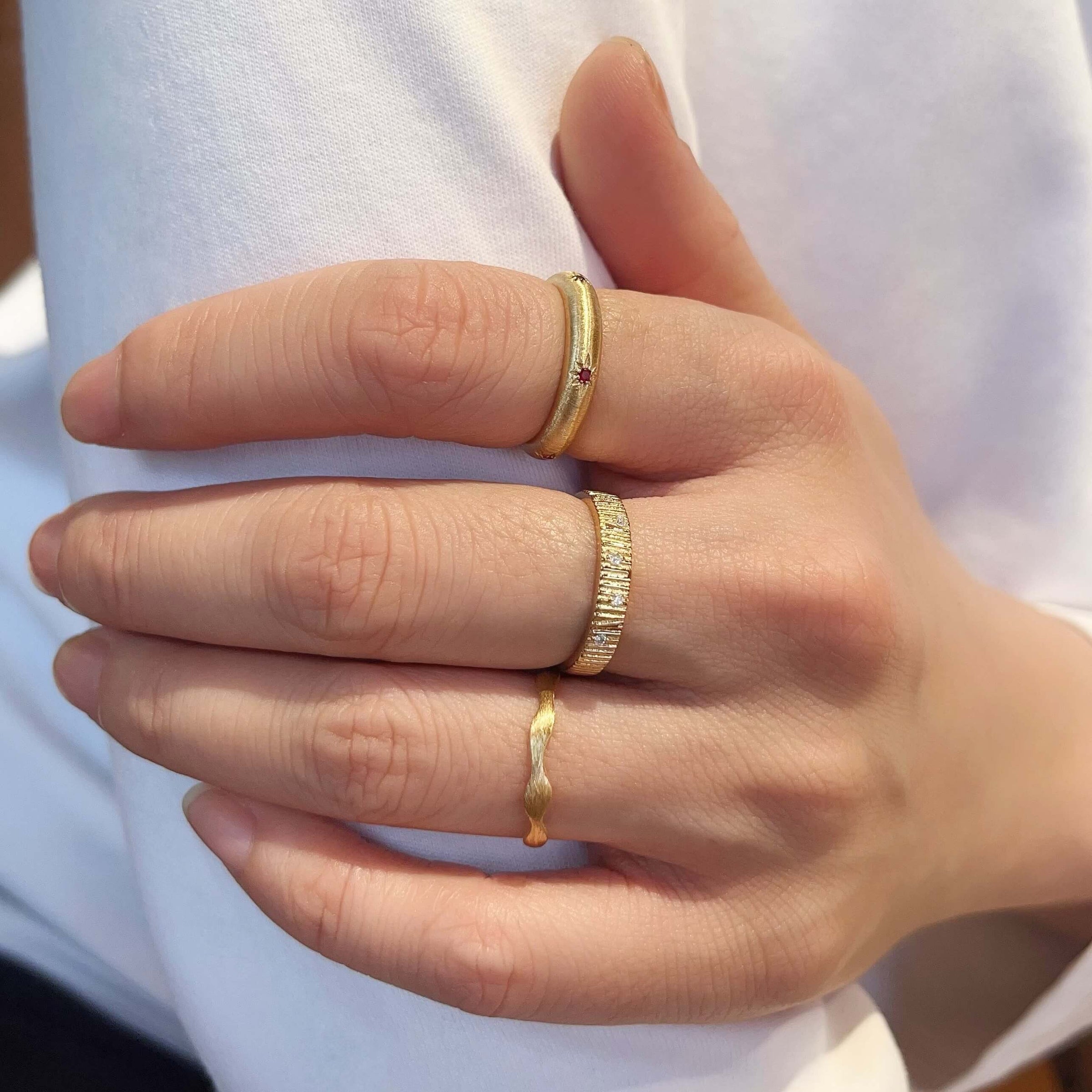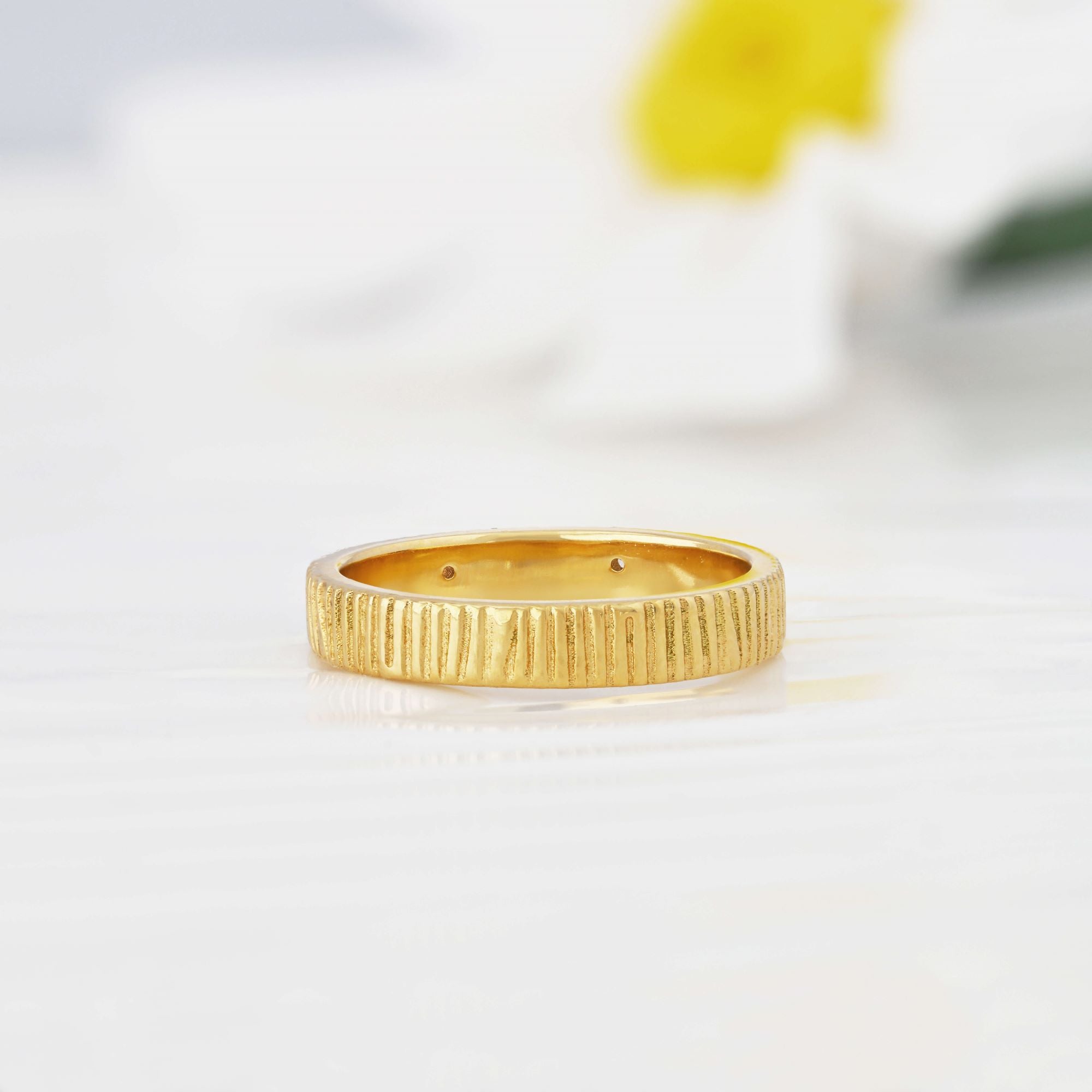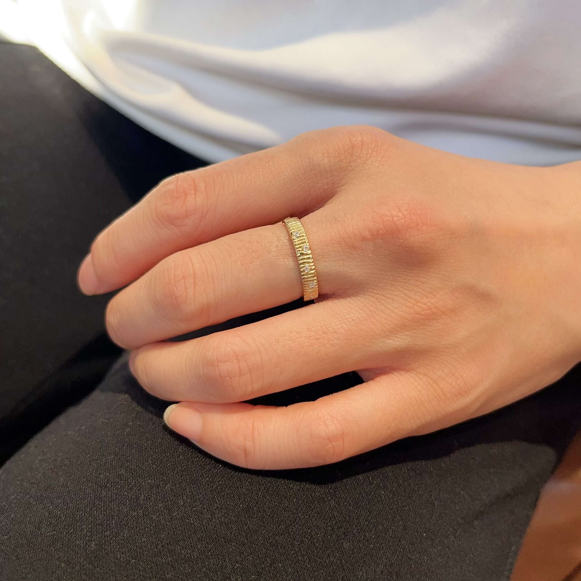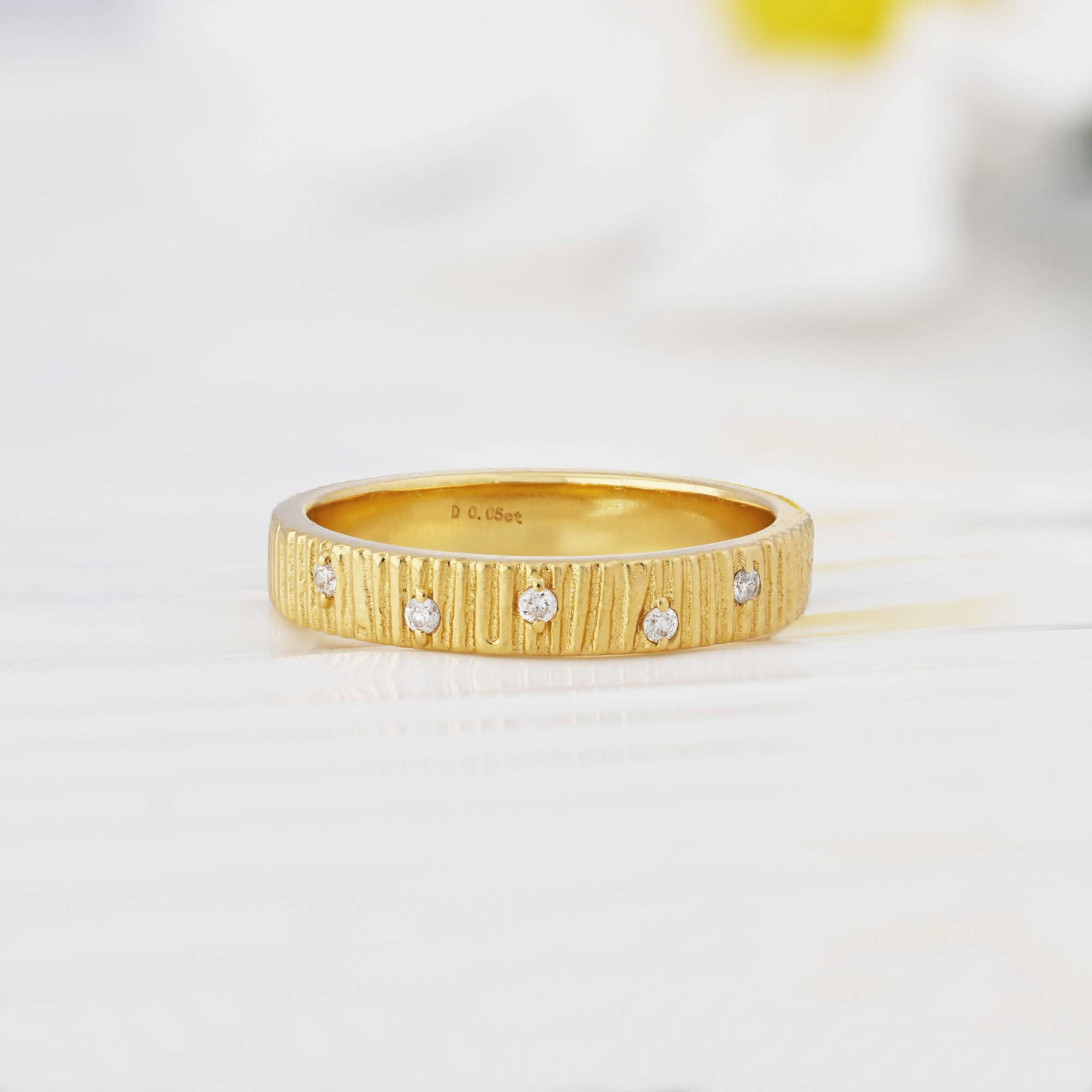 A forest, frozen in time. Handcrafted in 14ct solid gold, this band captures the fleeting beauty of morning light on the woodland. The surface is defined by a deeply tactile bark texture, carved to mimic the rugged, organic ridges of ancient timber. Scattered across this earth-toned landscape are five brilliant-cut natural diamonds, appearing like crystalline dewdrops clinging to the bark after a spring rain.