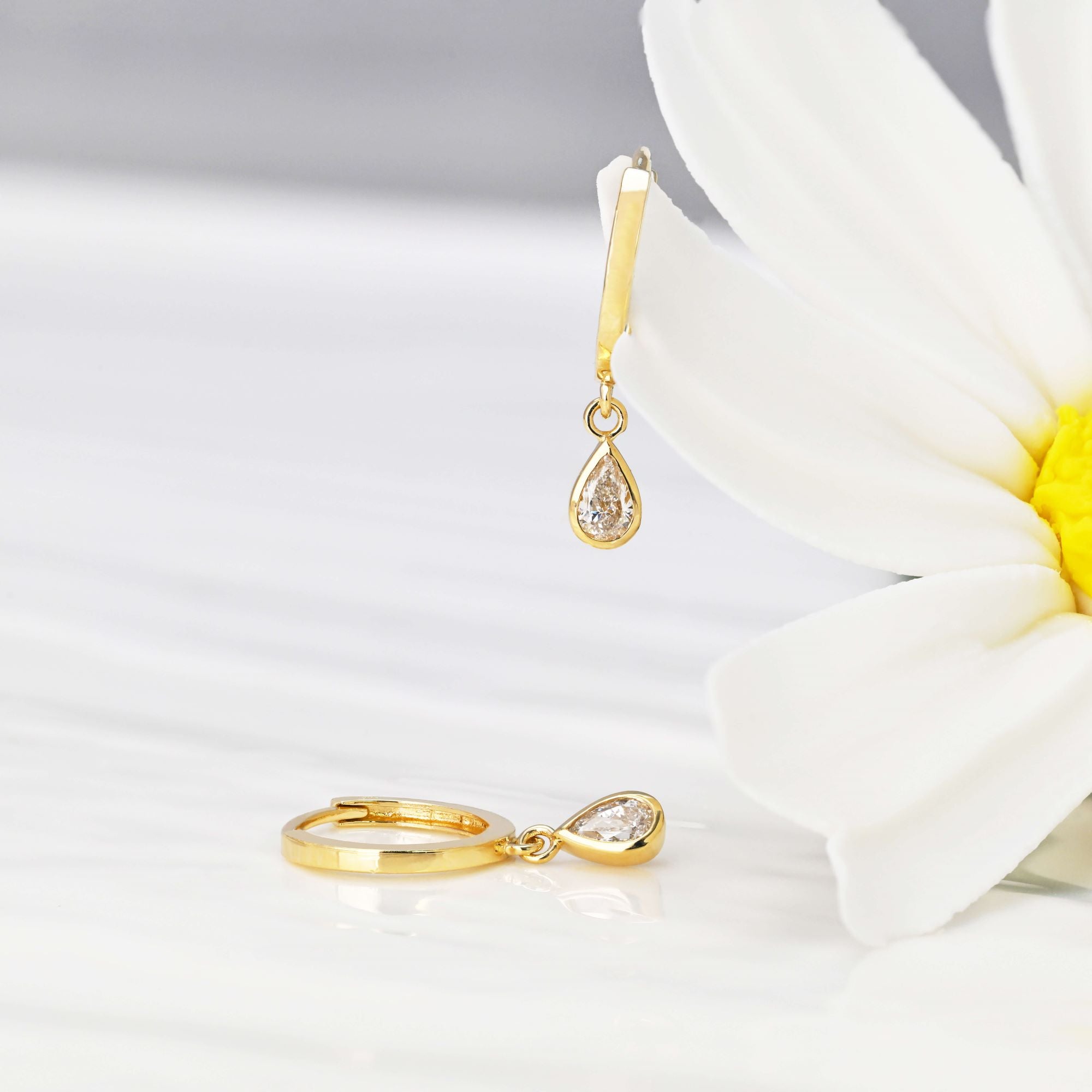 A modern take on a timeless silhouette. Crafted in 14k solid gold, these earrings feature a brilliant teardrop-cut lab diamond encased in a smooth bezel setting. This architectural frame follows the elegant taper of the stone, protecting its delicate point while creating a sleek, snag-free finish. Designed to catch the light with every movement, these drops offer a refined, "liquid" sparkle that transitions effortlessly from everyday wear to your most significant moments.