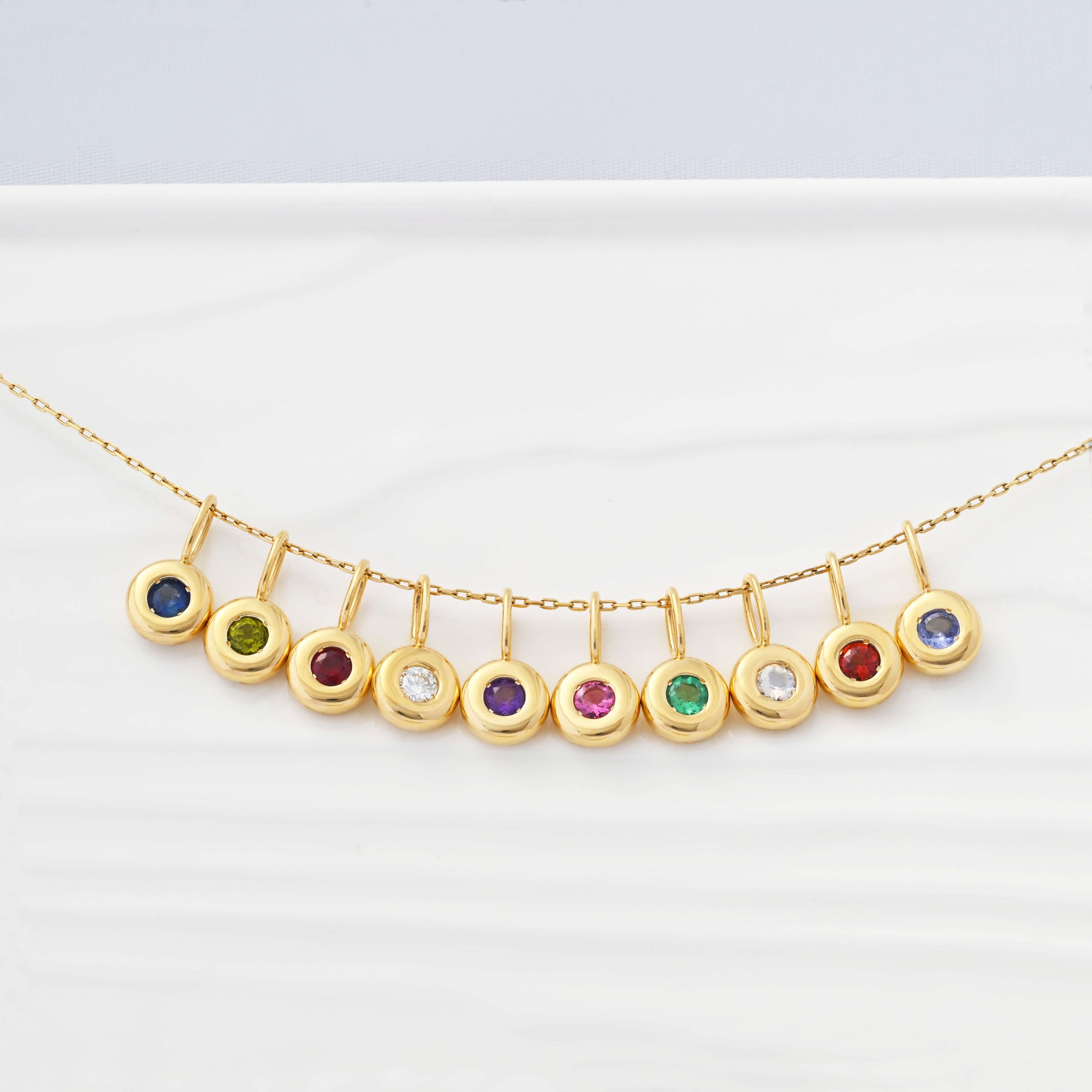 Jan: Garnet | Feb: Amethyst | Mar: Aquamarine | Apr: Lab-Diamond | May: Emerald | Jun: Moonstone | Jul: Ruby | Aug: Peridot | Sep: Blue Sapphire | Oct: Pink Tourmaline | Nov: Citrine | Dec: Tanzanite