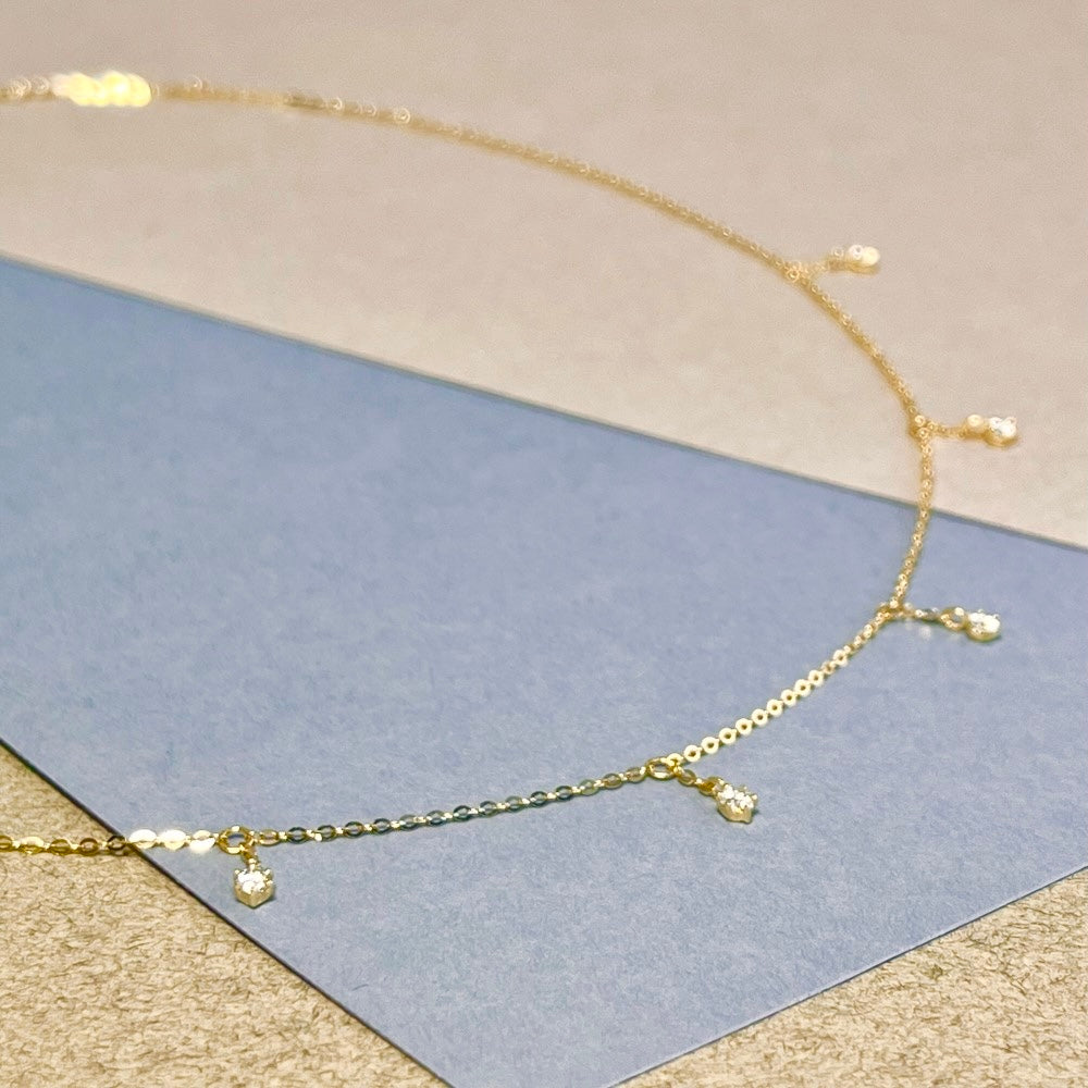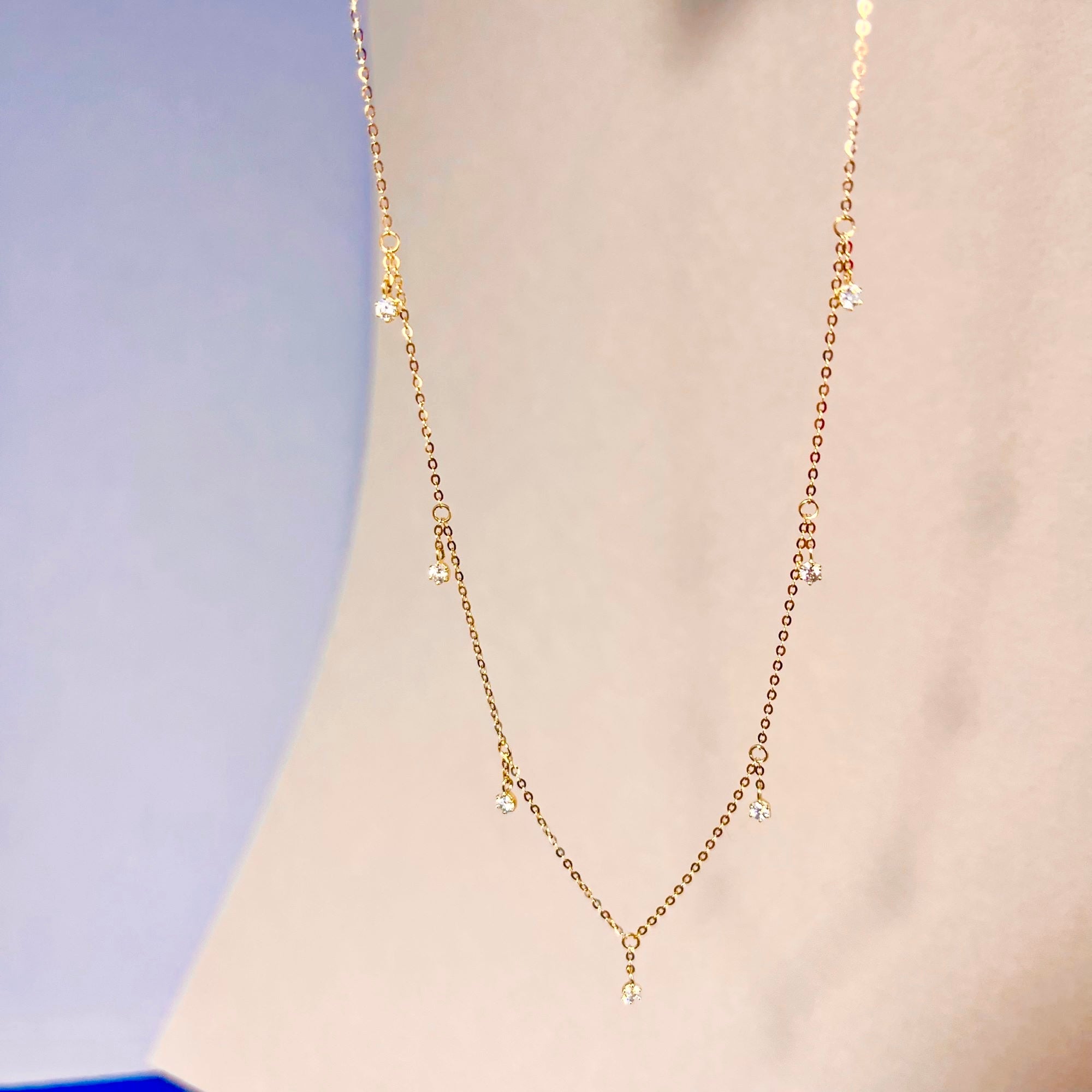This elegant 14k solid gold station necklace showcases seven prong-set moissanite droplets, offering a timeless sparkle for any occasion. Crafted with lab-created moissanite, it’s as brilliant as a diamond while being kind to both people and the planet.